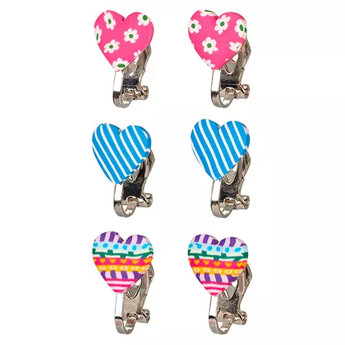 De set bestaat uit hartjesoorbellen in de kleuren roze met bloemen, blauw gestreept en regenboog.