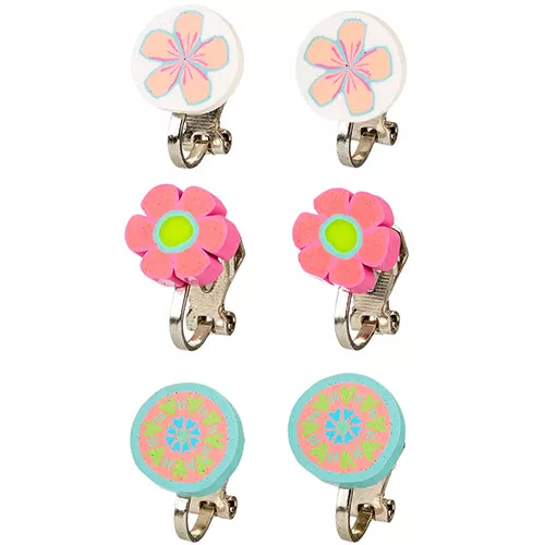 De set heeft drie paar clipoorbellen die versierd zijn met bloemen en fleurige patronen.