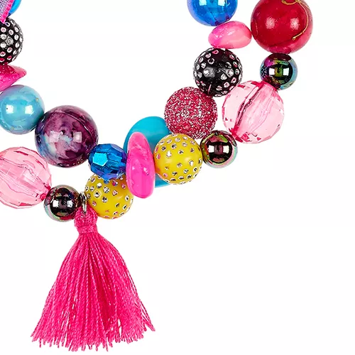Het armbandje met sprankelende kralen men een roze kwastje is elastisch en kan daarom eenvoudig om de pols worden gedaan.