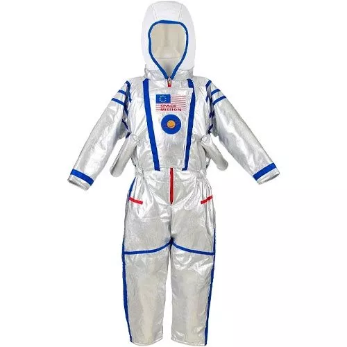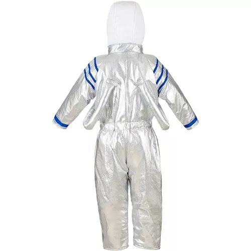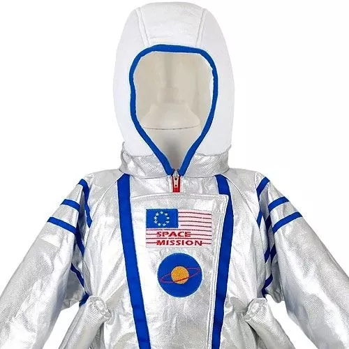 Het ruimtepak van gladde, zilveren stof bestaat uit één geheel en is licht van gewicht. De verkleedkleding wordt geaccentueerd met blauwe en rode strepen. Om het hoofd warm te houden, heeft het pak een fluwelen capuchon.