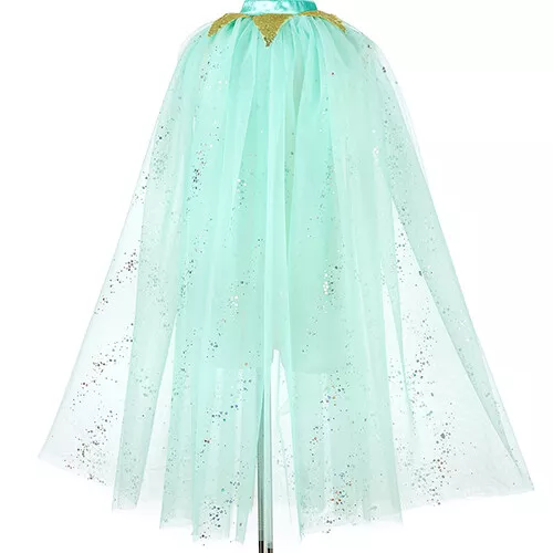 De prinsessencape is gemaakt van verschillende lagen mintgoene tule met glitters. De nekkraag van de cape bevat gouden driehoeken van pailletten stof.