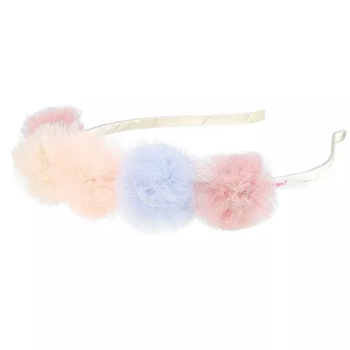 De kinderhaarband heeft een diadeem in een gebroken witte kleur en is versierd met verschillende gekleurde pompoms. De kinderdiadeem is enigszins buigzaam, waardoor de haarband zich vormt naar het kinderhoofdje.