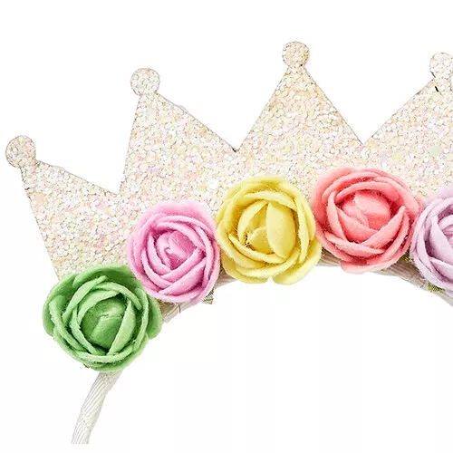 De haaraccessoire heeft een glitterkroontje met een rand van vilten rozen in regenboogkleuren. Het kroontje is bevestigd op een haarband, omwikkeld met geribbeld lint.