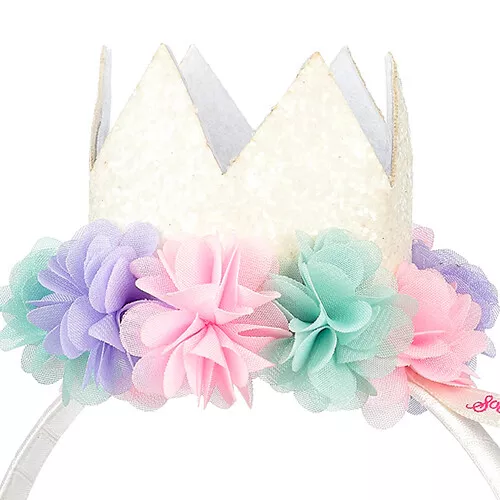 De haaraccessoire heeft een glitterkroontje met een rand van pastelkleurige, tulen bloemen. Het kroontje is bevestigd op een haarband, omwikkeld met lint.