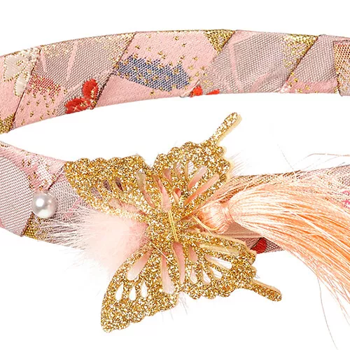 De kleurrijke band is omwonden met mooie stof en versierd met parels en een vlinder met pluizenbolletje en kwastje.