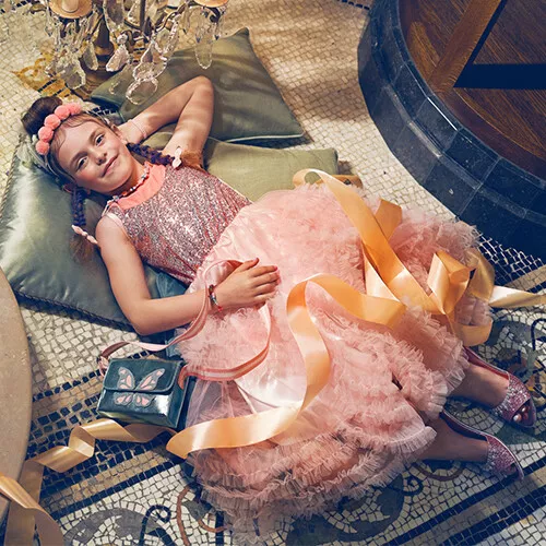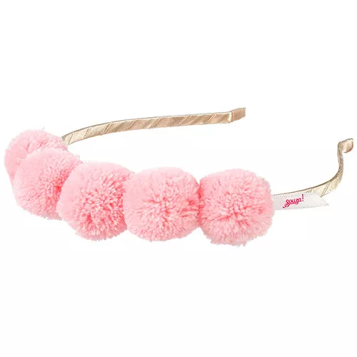Een feestelijke diadeem ‘Rosa’ van het Nederlandse merk Souza for Kids. De kinderdiadeem is omwikkeld met gouden lint en heeft bovenop vijf vrolijke pomponnetjes.