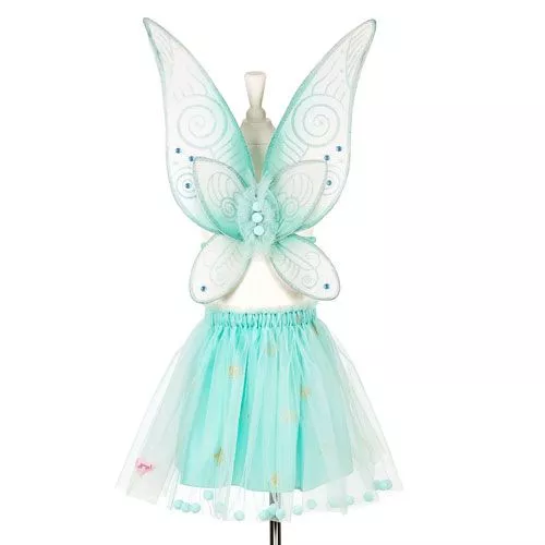 De verkleedset bestaat uit een mintgroen rokje van 34 cm met een dubbele laag tule, versierd met een rand van mintgroene pomponnetje en een onderrok van satijn met gouden glittersterren. De taille heeft een elastieken band.Â