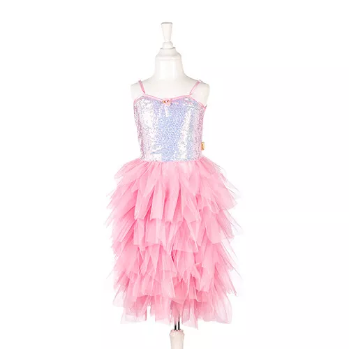 De voorkant van het bovenlijfje zit vol glitter pailletten, een echte showsteler. De rok van de jurk is gemaakt van satijn en lagen van tule, die elegant zwieren bij het ronddraaien.