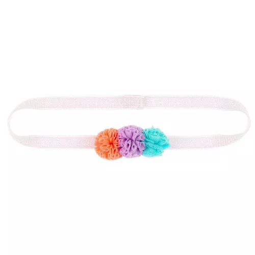 Deze modieuze haarband ‘Norine’ van het Nederlandse merk Souza for Kids heeft drie vrolijke tule pompoms. De haarband valt op in het haar met de drie bolletjes in het oranje, blauw en paars.