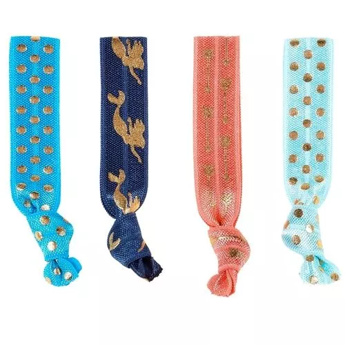 Vier kinderhaarelastiekjes ‘Haarelastiek Elsine, zeemeermin’ van het Nederlandse merk Souza for Kids voor alle kleine zeemeerminnen. De haarelastieken zijn bedrukt met gouden versieringen en worden geleverd als setje.