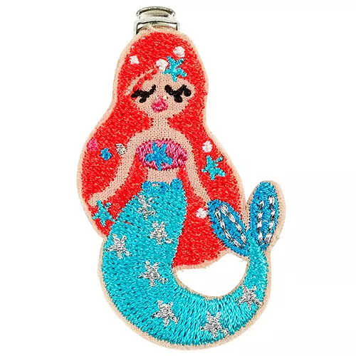 Een sprankelend haarspeldje ‘Jane’ van het Nederlandse merk Souza for Kids. Het haarklemmetje is bekleed met een sierlijke, geborduurde zeemeermin.