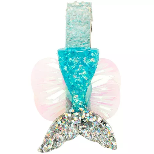 Een sprankelend haarspeldje ‘Rinette’ van het Nederlandse merk Souza for Kids. Het haarklemmetje is bekleed met een zeemeerminnenstaart met verschillende kleuren pailletten en parelmoer vinnen.