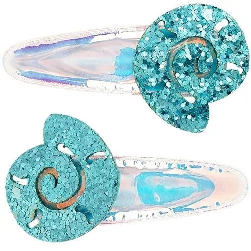 De blauwe-groene haarclipjes zijn bezet met glitters. De metalen speldjes sluiten eenvoudig met een klikje.