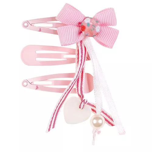 De roze haarversiering set  ‘Cayen’ van het Nederlandse merk Souza for Kids bestaat uit 1 haarspeldje met versiering en 2 gladde haarspeldjes.