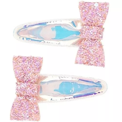 De haarstrikjes zijn gemaakt van kleine, roze pailletten, vastgezet op een holografische ondergrond. Wanneer deze het licht vangt, ontstaan prachtige kleurschakeringen.