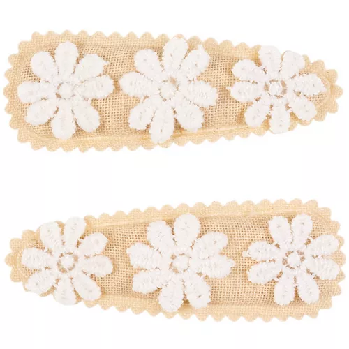 Fleur de dag op met deze twee vrolijke haarspeldjes ‘Ida’ van het Nederlandse merk Souza for Kids. De kinderhaarspeldjes hebben een jute look en zijn bekleed met drie witte, geborduurde madeliefjes op de bovenkant.