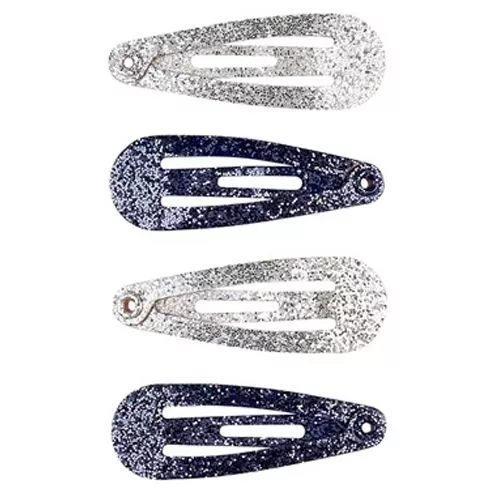 De haarclips zijn marineblauw en zilver en bezaaid met glitters.