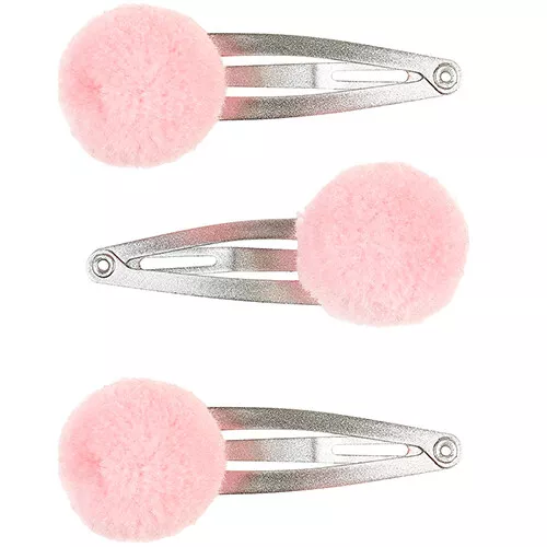De zilverkleurige haarclipjes hebben aan het uiteinde een roze pomponnetje. De metalen speldjes sluiten eenvoudig met een klikje.