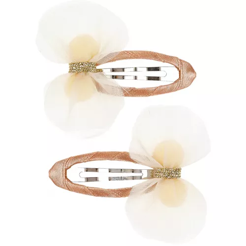 Versier het haar met deze twee schattige haarspeldjes ‘Martha’ van het Nederlandse merk Souza for Kids. De haarspeldjes zijn omwikkeld met een brons lint en zijn versierd met witte, tule strikjes met een gouden lintje.