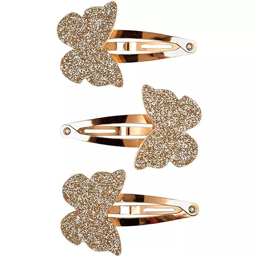 Versier het haar met deze drie kinderhaarspeldjes ‘Penelope’ van het Nederlandse merk Souza for Kids. De glanzende, gouden haarclipjes hebben aan het uiteinde een sprankelende vlinder.