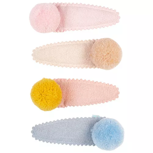 Ieder metalen kinderhaarspeldje heeft een stoffen bekleding met een gekartelde rand. Op het uiteinde hebben de speldjes een vrolijk pomponnetje.