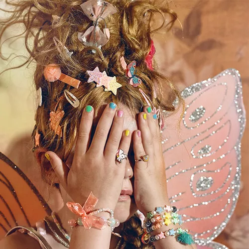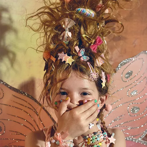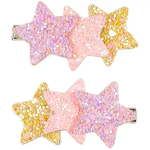 Versier het haar uitbundig met deze twee sprankelende haarspeldjes ‘Wyke’ van het Nederlandse merk Souza for Kids. Elk kinderhaarspeldje heeft drie fonkelende sterren in geel, roze en paars.