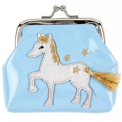 Een blauw lak kinderportemonneetje ‘Marith’ van het Nederlandse merk Souza for Kids, met een stijlvol wit paard vol glitters en harige staart. Handig als de prinses haar lippenstift mee wil nemen.