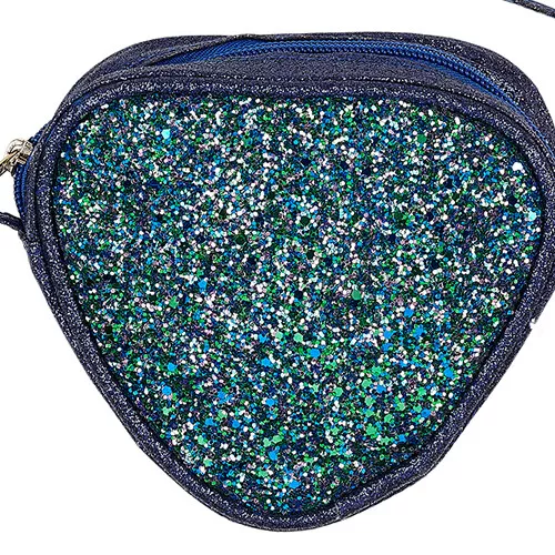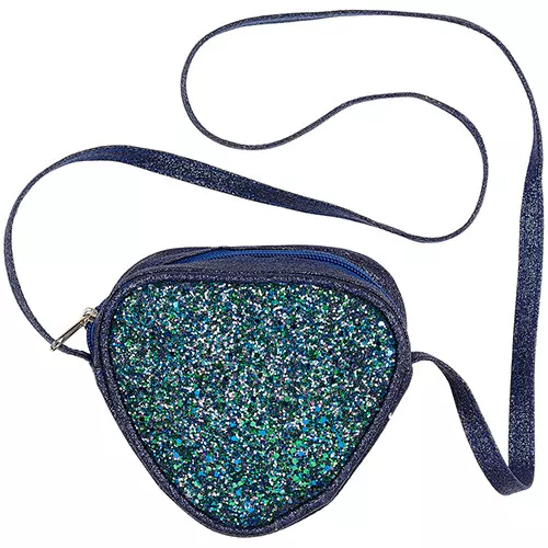 Het blauwe kindertasje met sprankelende glitters heeft een vleugje chique, sluit met een rits en heeft een lang hengsel.