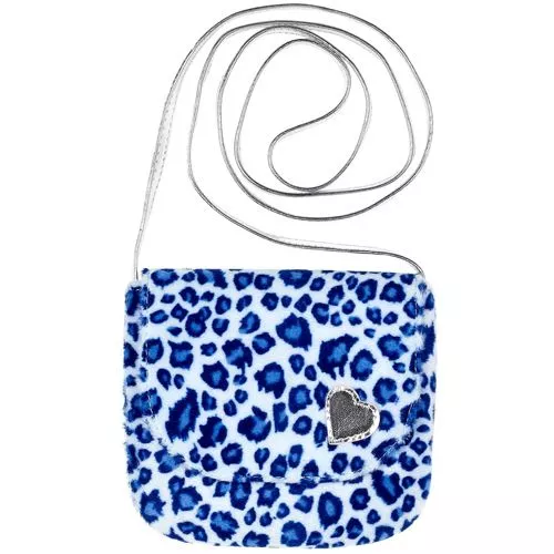 Het kindertasje is versierd met een blauwe panterprint en glimmend hartje. Het glimmende blauwe koord is lang en kan prima als schoudertas maar ook als nektasje gedragen worden. Het tasje sluit met een magneetknoopje.