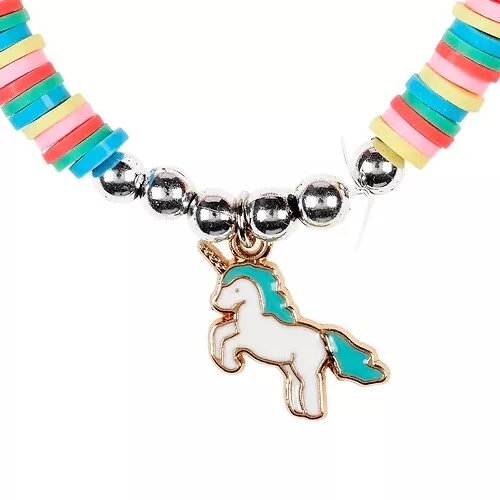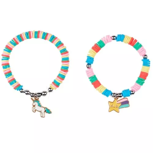 Kinderen maken zelf twee kleurrijke armbanden met deze knutselset van het Nederlandse merk Souza for Kids in de kleuren van de regenboog en met twee bedeltjes, één van de eenhoorn, de andere van een vallende ster.
