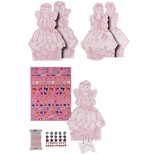 De knutselset bestaat uit: 4 elfjes om in te kleuren, 1 vel met stickertjes, 1 set zelfklevende glitters, 4 houdertjes en roze lint.Â