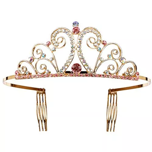 Deze prinsessenkroon heeft een kroontje met siersteentjes in verschillende kleuren en is bevestigd op een gouden kinderdiadeem.