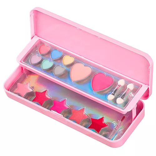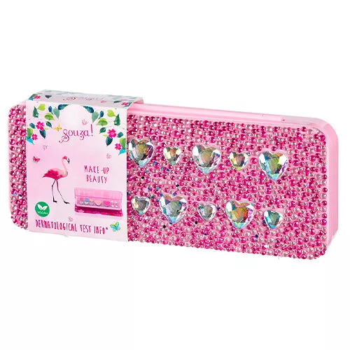 Een make-up doosje van het Nederlandse merk Souza for Kids met vanille lipgloss, zes tinten oogschaduw, twee applicator kwastjes en twee soorten blush.