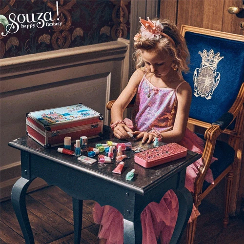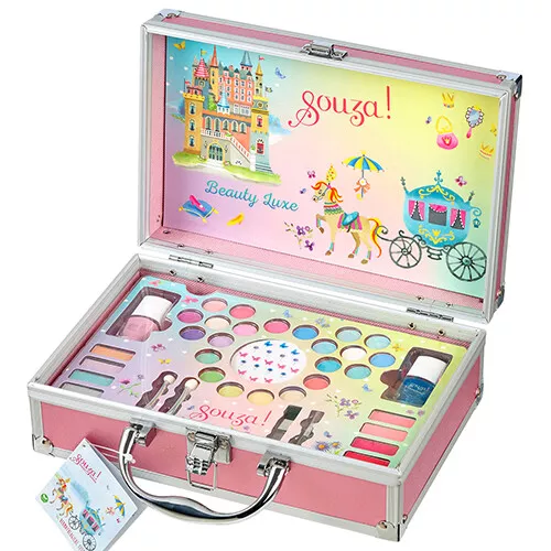 Een koffer vol make-up van het Nederlandse merk Souza for Kids voor de beauty guru in spé. Een beetje lipgloss hier, wat oogschaduw daar…