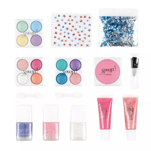Een grote kindermake-upset van het Nederlandse merk Souza for Kids voor meiden die houden van mooie oogmake-up, roze wangen, gelakte, versierde nagels én mooie, zachte lippen.