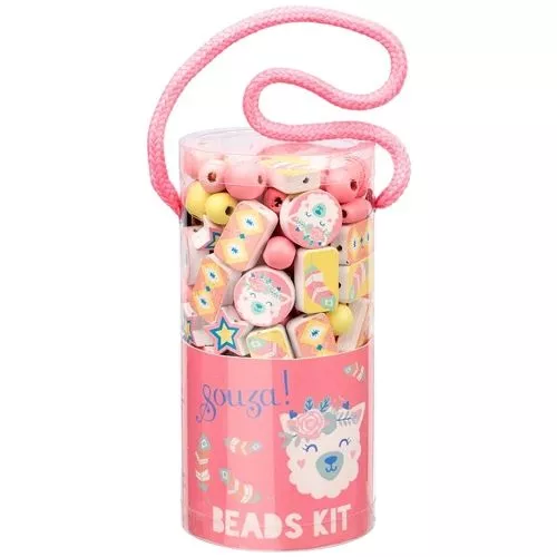 Deze knutselset ‘kralen knutsel set lama pastel roze-koraal’ van het Nederlandse merk Souza for Kids bestaat uit stervormige, buisvormige, rechthoekige en platte en bolle ronde kralen in de kleuren zachtroze en zachtgeel.