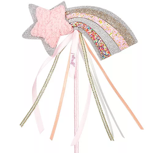 Het toverstokje is omwikkeld met lint en heeft bovenop een stoffen, roze ster met daarachter een regenboog van sprankelende glitters. Daaronder zijn linten bevestigd voor een betoverend effect tijdens het zwaaien met de staf.