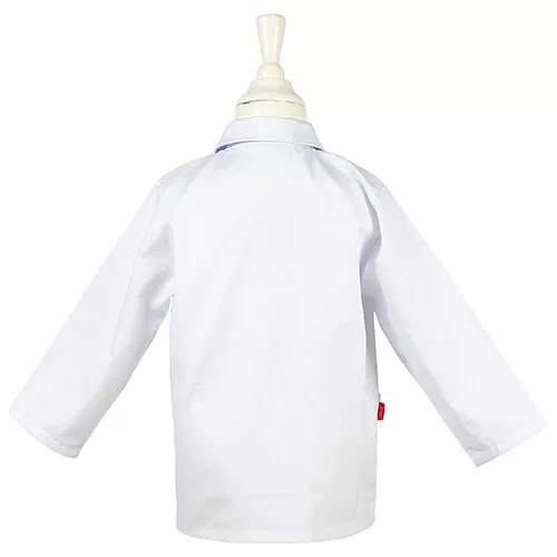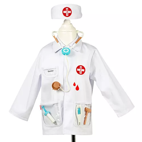 De doktersjas heeft doorzichtige zakken; zo vind je zonder problemen het spuitje, hamertje, thermometer of stethoscoop. De hoofdband van de set is comfortabel te dragen door het elastiek aan de achterzijde. De jas heeft geborduurde details.