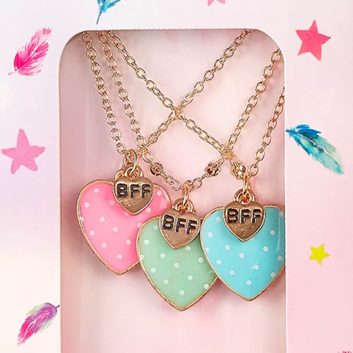 Drie goudkleurige vriendschapskettingen van het Nederlandse merk Souza for Kids voor echte hartsvriendinnen. Met drie hangers van verschillende kleuren hartjes en de tekst ‘BFF’, Best Friends Forever.
